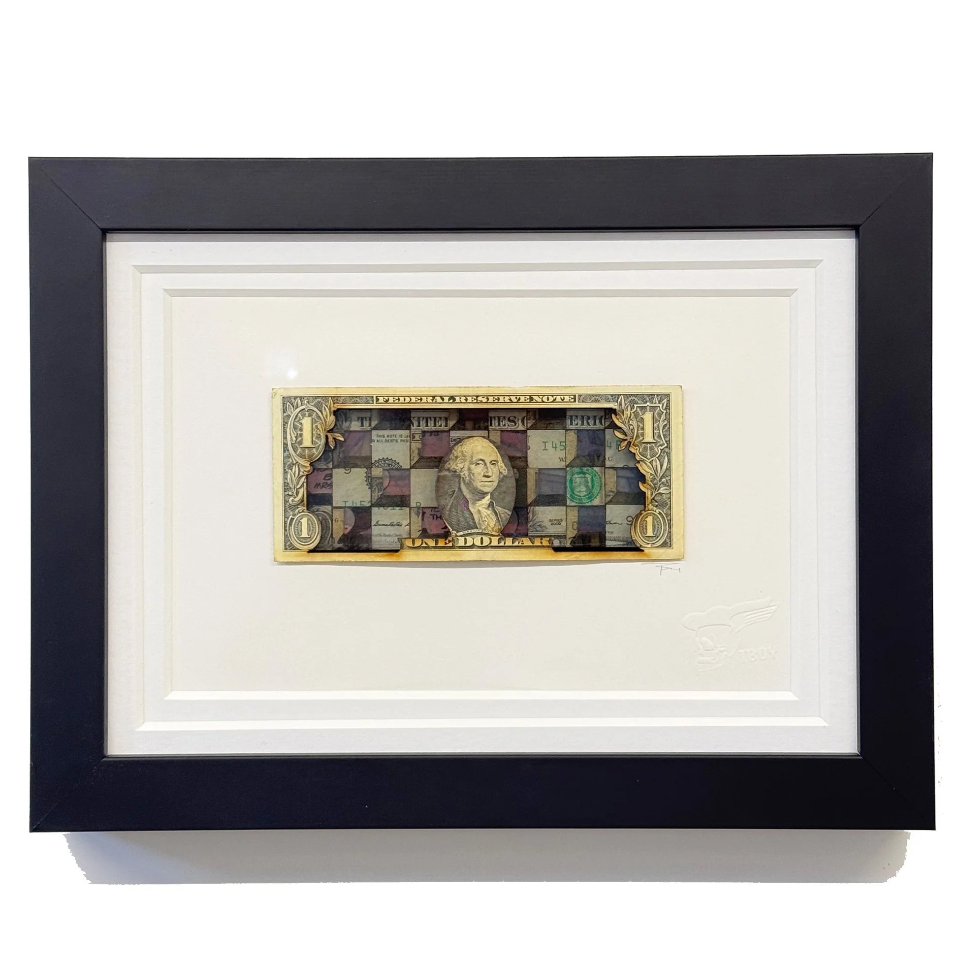 Medium: hand made piece with layers of original one dollar notes pieces together and set in resin under one dollar note